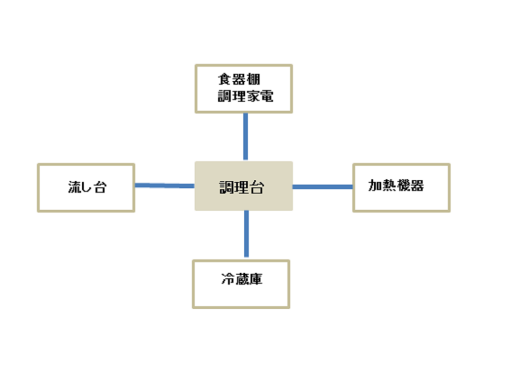 台所の中で頻繁に使う調理台を中心に、流し台、加熱機器、食器棚、調理家電、冷蔵庫とどううまく連携させるかがカギ。調理台から各場所へ最大3歩で移動出来るのが、効率のいい動線です。